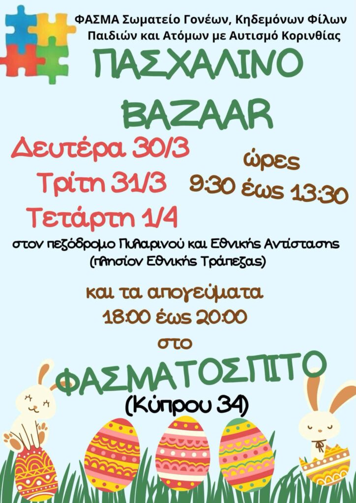 ΠΑΣΧΑΛΙΝΟ ΠΑΖΑΡΙ By zervouIn ΔράσειςPosted 20 Μαρτίου, 20260 Comment(s) Σας περιμένουμε στη γνωστή μας γωνιά Από Δευτέρα 30 Μαρτίου έως Τετάρτη 1 Απριλίου 2026 Πεζόδρομος Πυλαρινού & Εθνικής Αντιστάσεως Πρωινά 9:30 π.μ.- 13:30 μ.μ. ΦΑΣΜΑΤΟΣΠΙΤΟ Κύπρου 34 Κόρινθος Απογεύματα 6:00- 8:00